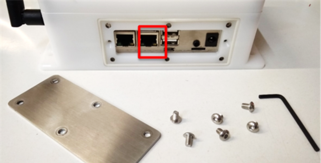 To ensure waterproofness of the electronics inside the gateway, the Ethernet along with other ports are protected with a stainless-steel cover fixed with six screws at the bottom of the gateway case. To remove the cover you will need a 2.5mm allen wrench to unscrew the six screws as shown in the next picture: