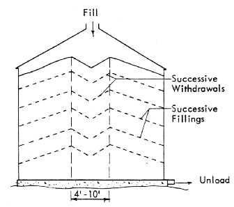 Remove grain at regular intervals (daily or more often) during filling to remove the peak. The goal is to draw the surface daily to an inverted cone. Repeated withdrawals remove many of the fines that accumulate in the center core (Figure 2).