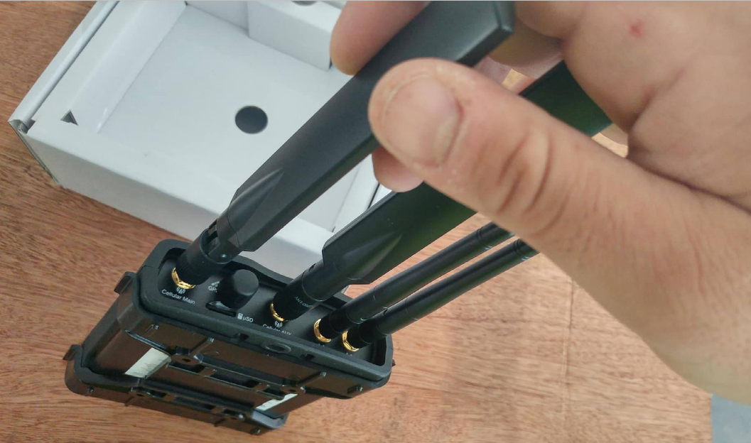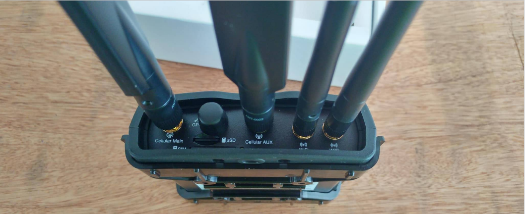 On the right side the WiFi (2.4 GHz) antennas and on the left side the 4G/GSM antennas: