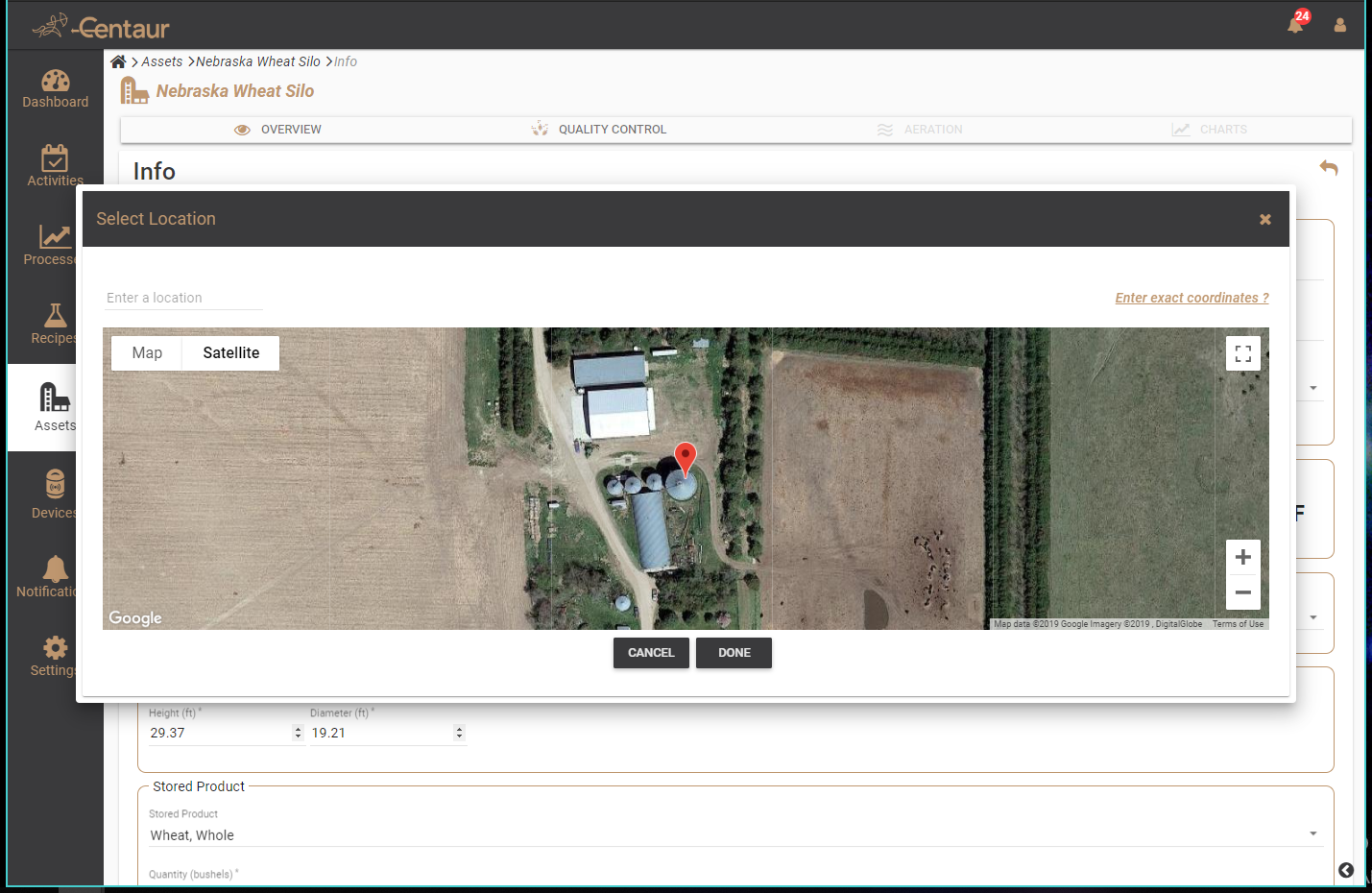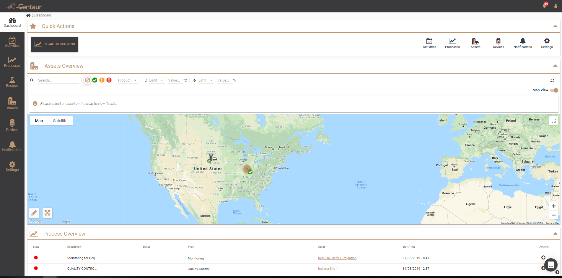 The Centaur Cloud Platform follows a digital twin-based approach, where all tasks such as monitoring, pest treatment, and quality processes are linked to an asset (i.e., a storage facility). To create a new asset, follow these steps from the main dashboard of the Centaur Cloud App: