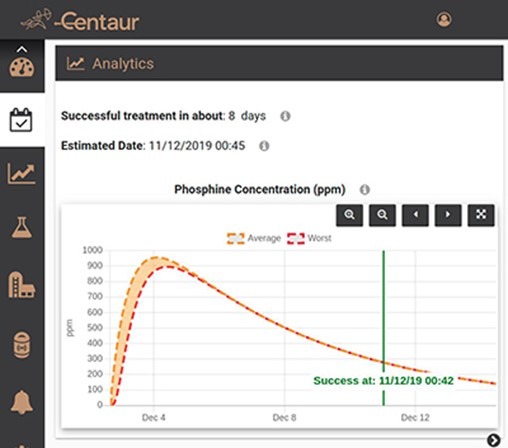 A fumigation process could be applied for insect control. Using Centaur’s platform, a methodology for planning precision phosphine fumigations can be established (Figure 4). Users monitor the process using Centaur’s sensors and receive notifications for the fumigation duration and when success could be enabled.