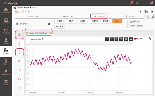 Temperature and moisture are measured physically in a very small number of spots inside the grain. Although those values are presented as charts, like in traditional monitoring systems, the actual value comes through Centaur’s proprietary modeling methodology. The user can get information about grain temperature and moisture content fluctuations reported by the Centaur® sensors in the “Charts” tab (figure 1).