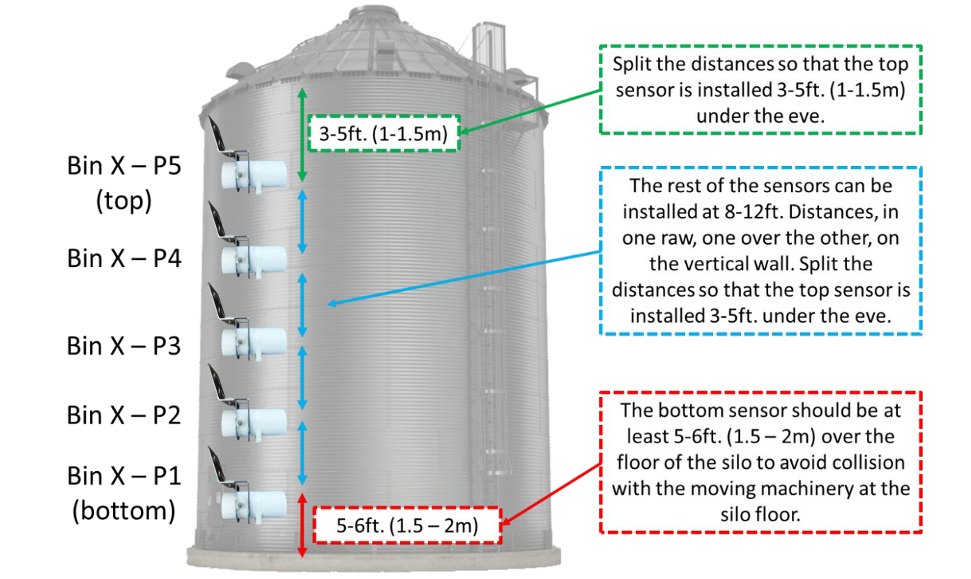 The highest sensor should be 1–1.5 m below the roof eave for accurate readings in the upper grain layer.