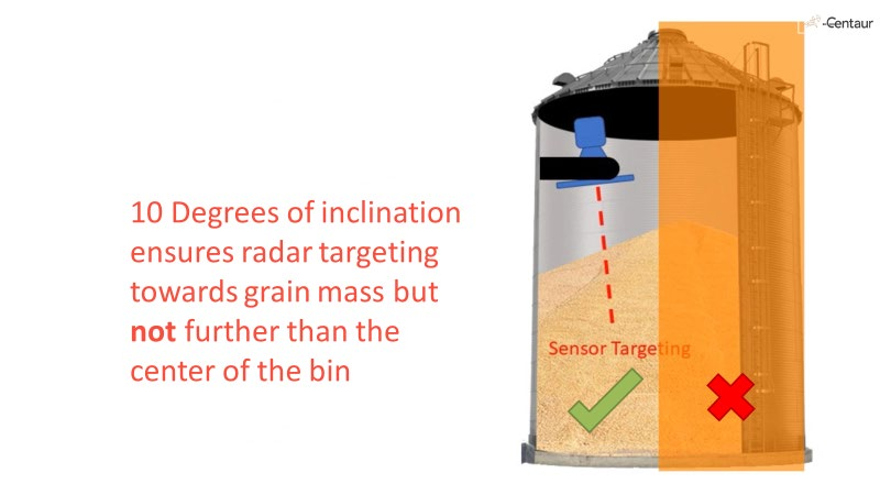 Set the radar angle downward toward the bin center but not beyond it; approximately 10° inclination ensures accurate grain-mass targeting.