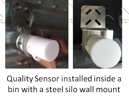 Each bin includes a few wireless quality-monitoring sensors, vertically aligned on one side of the bin wall. Sensors measure internal conditions such as temperature, humidity, and CO₂ /O₂ concentrations to support predictive analytics.