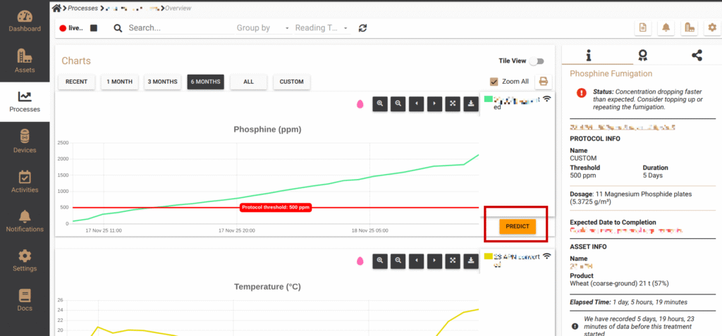 Information like the current status of the pest treatment, the selected fumigation protocol, the dosage, the expected date to completion and the current weather conditions in the area are displayed on the right.